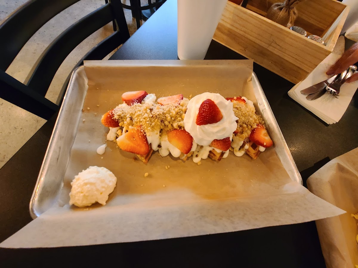 The menu leans into comfort food with confidence. Waffles are the headliner, of course, but they aren’t treated like an afterthought. Each waffle comes out golden, crisp on the outside, fluffy in the middle, and evenly cooked, which sounds simple until you’ve seen how often diners miss that balance. A server explained that the batter is made fresh daily and rests before service, a real-world method many breakfast kitchens use to improve texture and flavor. That small detail shows up in every bite. I ordered a classic waffle with butter and syrup, while a friend went for a loaded version topped with strawberries and whipped cream. Both plates disappeared fast.